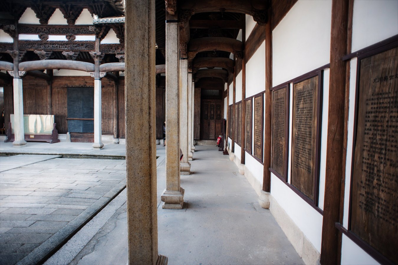 这个胡氏宗祠占地近3亩,坐北朝南,前后三进,走进院落之中,眼前所看到的景象似乎与很多的宗祠有着明显的区别,院落两侧为长廊,墙壁上悬挂有胡氏家族历史上著名的人物,为了防止雨水将木柱子淋湿腐蚀,所以外侧的柱子皆使用的石柱子。