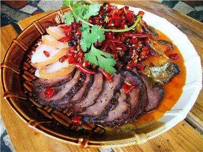 人民熟悉的滋味,尤其那弹牙的口感,让人难忘。蕨粑是用当地山民挖来的天然蕨根做的,样子就像是黑色的水磨年糕。做法也很简单,腊肉煮五分钟后放凉切片,入油锅煸香,加少许辣豆瓣,接着下蕨粑片、青蒜、芹菜拌炒均匀即可。
