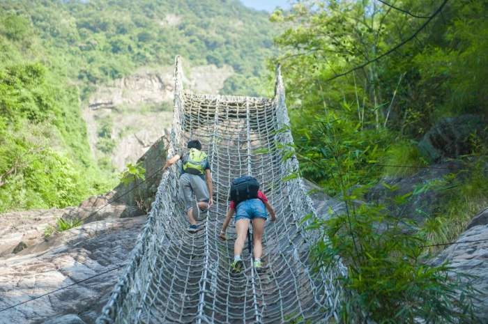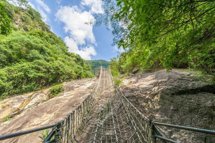 在九州驿站,还能体验到野外活动的刺激感,在天然氧吧之中攀岩、走高空索桥,找寻森林深处的奥秘。说到这里,九州驿站内的瀑布也是不计其数,由于海拔高,落差大,天门沟内形成了百余级流水瀑布,有的气势磅礴,宛若从天上倾泻而下,被称为“天门飞瀑”,远近闻名;有的婉转细薄,像一片片水帘,汇到一起,形成蜿蜒的山间小溪。
